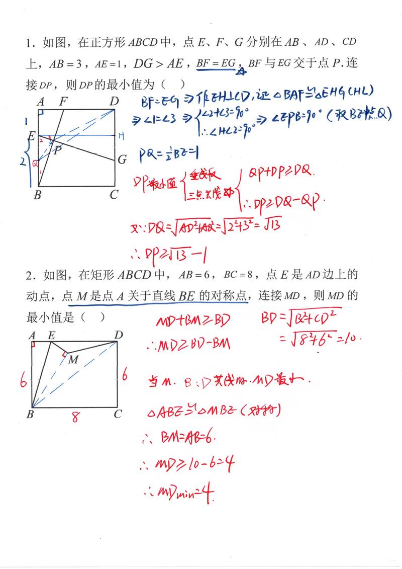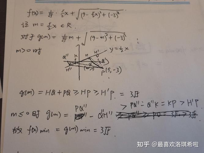 几何中的最小值问题也很有趣,在平面上给定两个点 A 和 B,以及一条直线 l,我们需要在 l 上找到一个点 P,使得 PA + PB 的和最小,解决方法是利用对称性:先找到点 A 关于直线 l 的对称点 A',然后连接 A' 和 B,与直线 l 的交点就是所求的点 P,这是因为两点之间线段最短,举个例子,假设 A(1,2)、B(4,5),直线 l 是 x 轴,先求 A x 轴的对称点 A'(1,-2),然后连接 A'B,直线 A'B 的方程是 y = (5+2)/(4-1)x + b,计算后与 x 轴相交,得到点 P 的坐标,这种方法在几何题中非常实用。