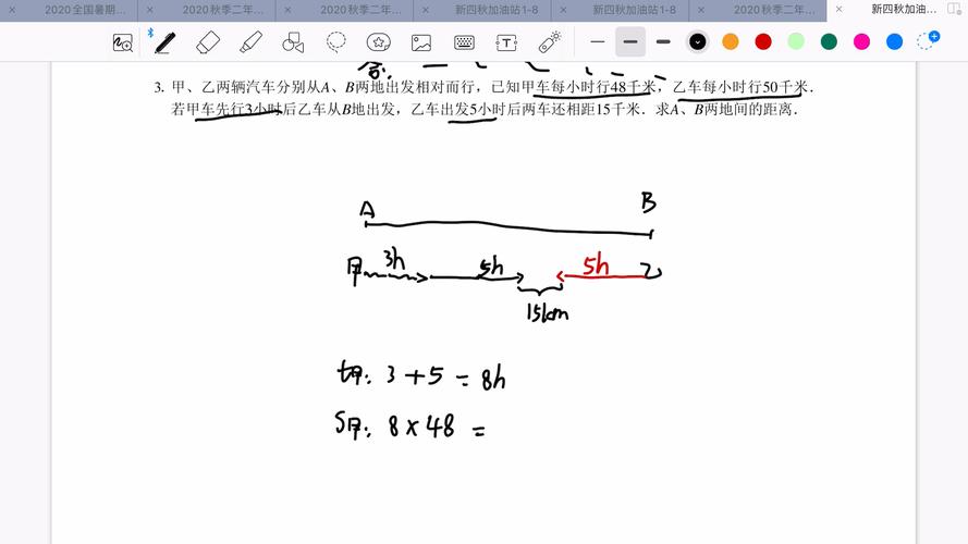 在实际操作中,画图能帮助学生直观看到距离的变化,假设A和B从相距100米的两点出发,A以2米/秒的速度向B移动,B以3米/秒的速度向A移动,我们可以画一条线段,左端A,右端B,标出100米,计算相对速度(5米/秒),并在图上逐步标记每秒的位置,直到两点相遇,通过这种可视化,学生更容易理解为什么相遇时间是100/5=20秒。