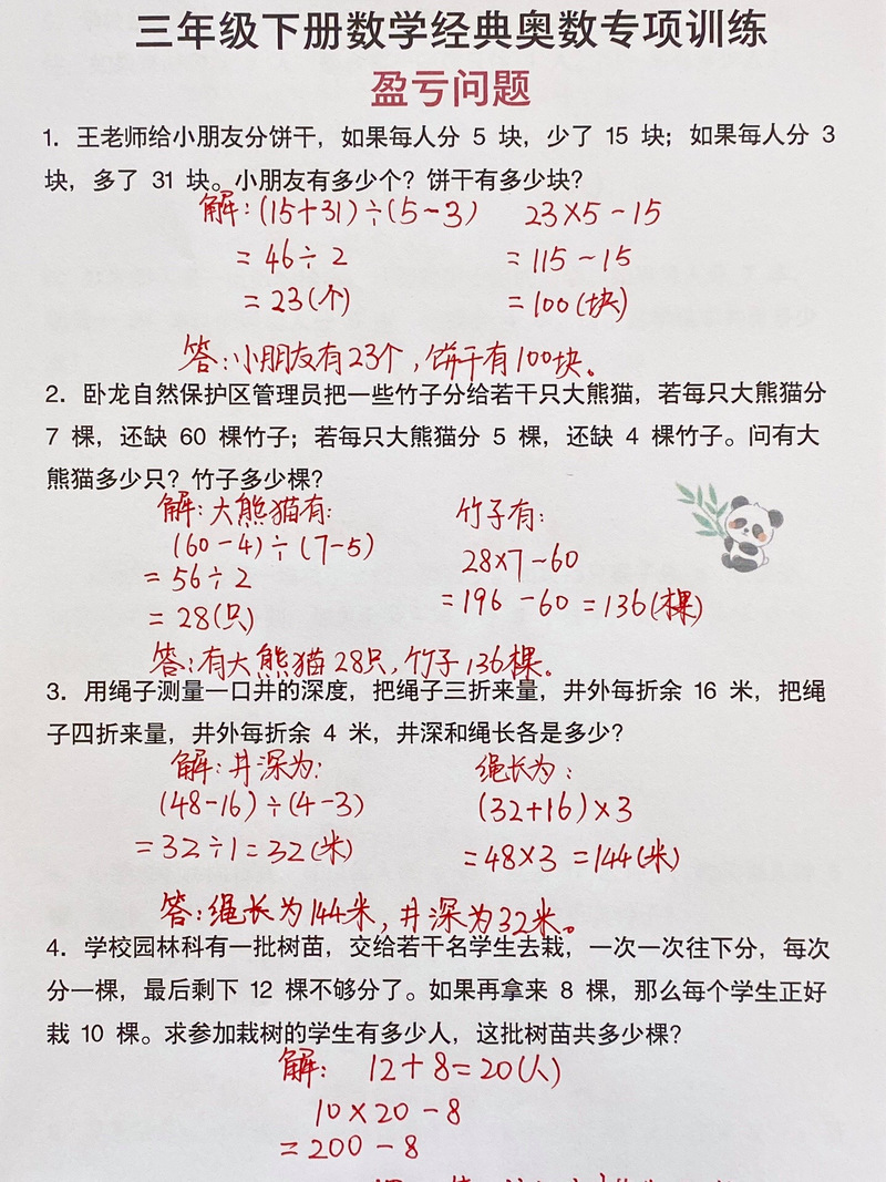 理解双亏问题的关键在于把握“亏”的本质是分配不足,通过比较两次分配的差异,找出不变量与变化量之间的关系,建议学生在解题时养成画线段图的习惯,直观展示数量变化;完成计算后,将结果代入原题验证,确保答案符合所有条件。