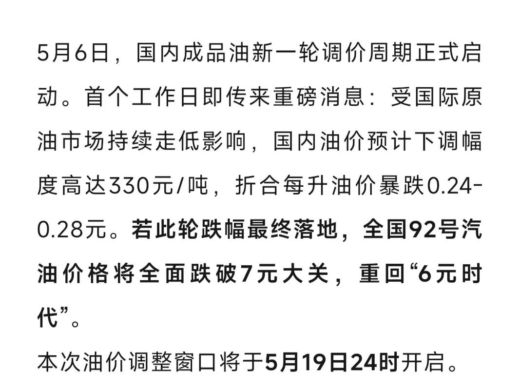 随着国际原油市场的波动和国内成品油价格机制的调整,一则关于92号汽油价格的消息引发了广泛关注:92号汽油或重返6元时代,这一变化不仅关系到广大车主的出行成本,也是观察宏观经济形势和能源市场走势的一个重要风向标。