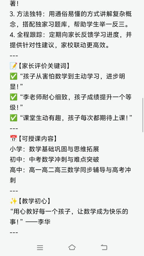 找到可靠家教的渠道多种多样,您可以根据便捷性和信任度进行选择,传统途径包括通过学校老师推荐,他们熟悉教学大纲和孩子情况,可能提供资深教师或优秀高年级学生资源;朋友或家长圈的口碑介绍也值得信赖,能获得真实反馈,现代方式则更灵活:在线平台如“猿辅导”、“学而思”等专业机构提供标准化服务,但可能缺乏个性化;家教网站或APP(如“掌门1对1”、“轻轻家教”)允许筛选教师资料、查看评价,适合快速匹配;社交媒体群组(如本地家长微信群)常有兼职家教信息,但需谨慎验证资质,大学生家教是性价比之选,尤其是师范院校数学专业学生,他们时间灵活且充满热情,可通过高校论坛或学生会联系。