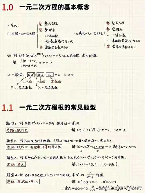 - 例题与解析:选择典型例题,详细书写解题步骤,并用彩色笔圈出关键转换点,在旁白处添加思路注释,如“这里运用了配方法”或“易错点:符号处理”。