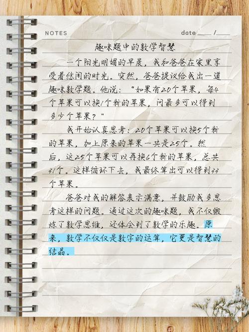 主题是文章的灵魂,小学生应选择自己熟悉且感兴趣的主题,这样写起来更有动力,可以从日常生活中找灵感,比如购物时的折扣计算、制作手工时的图形测量、或体育比赛中的分数统计,主题不宜太复杂,尽量简单具体,我是如何用乘法分配律快速算钱的”或“从玩具积木中认识立体图形”,贴近生活的主题能让文章更生动,也更容易引起读者共鸣。
