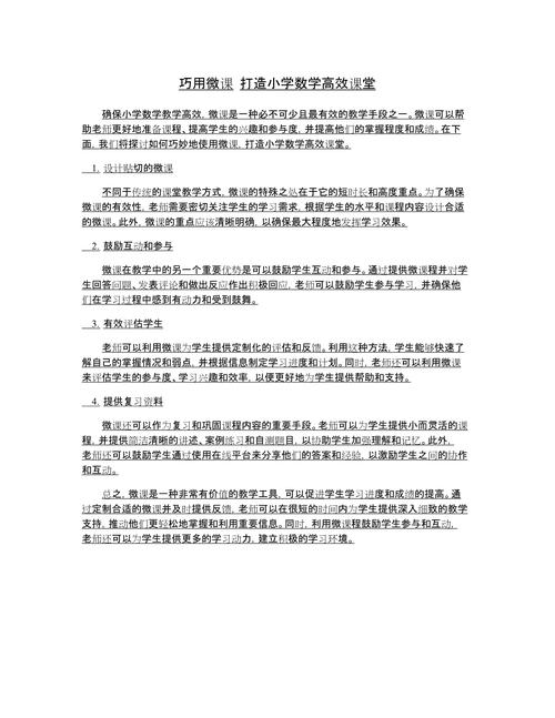 在数字化教育浪潮中,微课已成为中小学数学教学的重要辅助工具,它以其短小精悍、聚焦知识点的特点,能够突破传统课堂的时空限制,助力学生个性化学习,对于教师而言,掌握微课制作方法不仅能提升教学效率,还能激发学生对数学的兴趣,本文将系统阐述中小学数学微课的制作要点,从概念到实践,提供结构化指导。